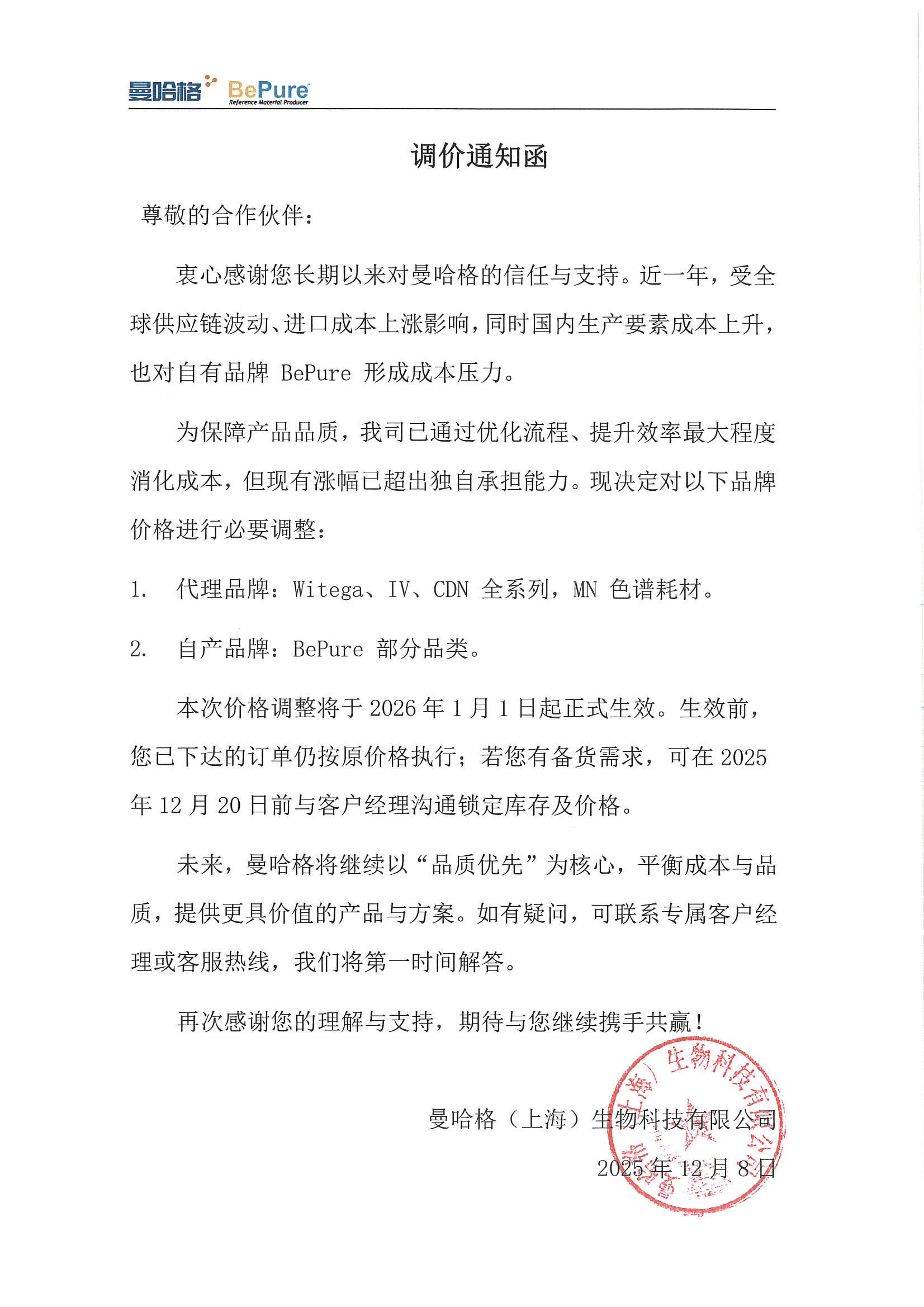 本次价格调整将于2026年1月1日起正式生效。生效前,您已下达的订单仍按原价格执行;若您有备货需求,可在2025年12月20日前与客户经理沟通锁定库存及价格。