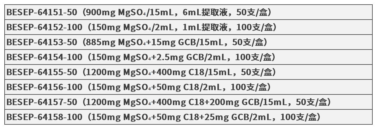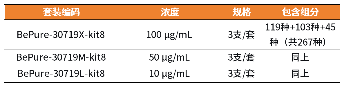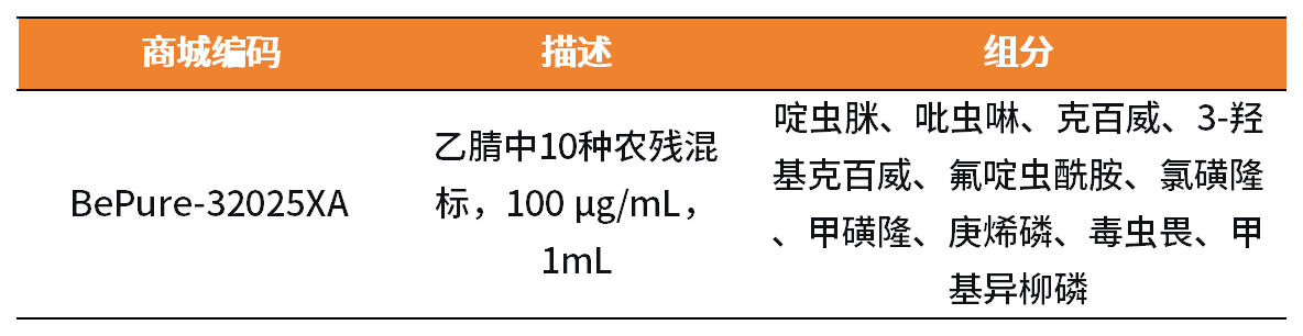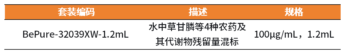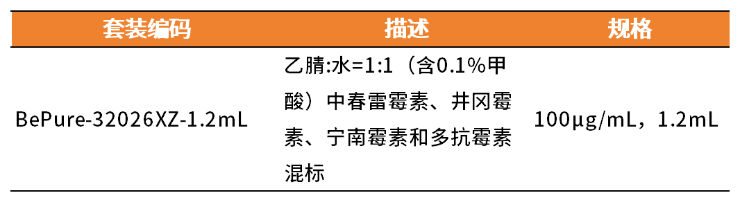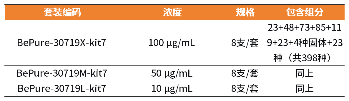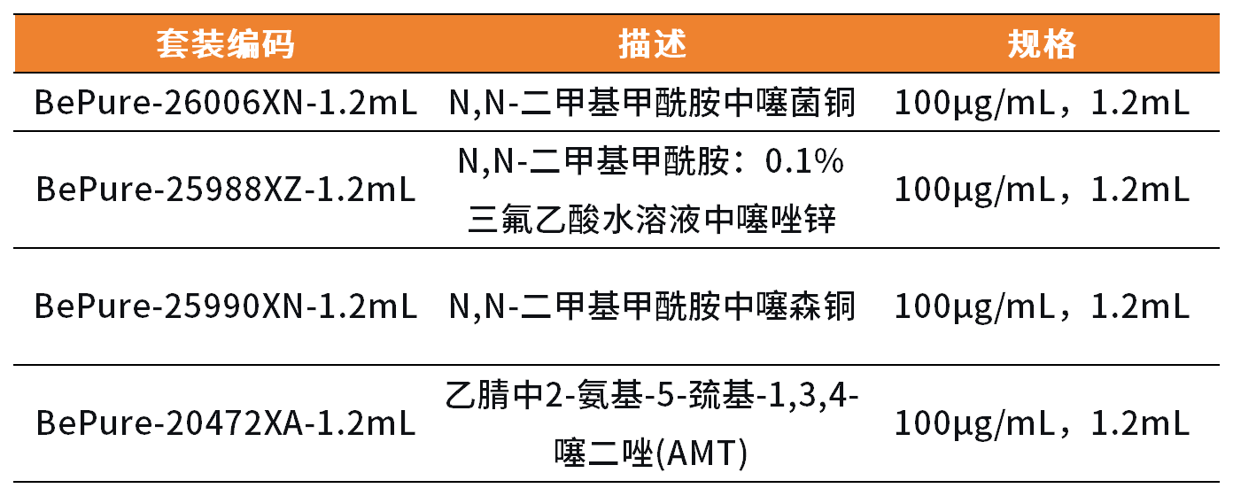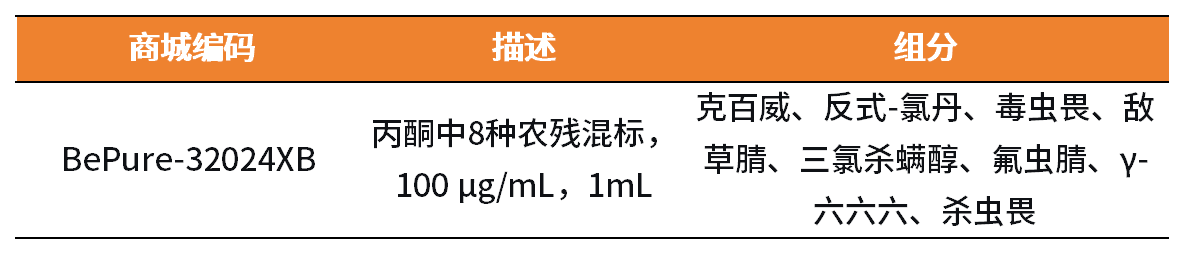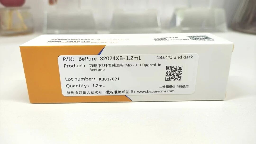 本标准覆盖更广泛的农药种类,BePure推出8支/套的混标组合,同样提供三种浓度,满足不同实验室的定量需求。